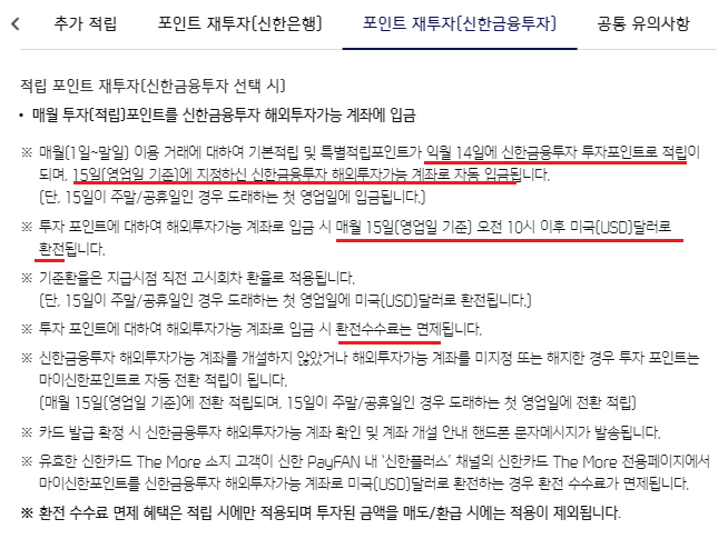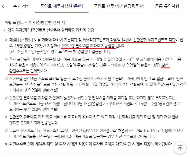 적립된 금액은 다음월 14일에 신한은행 투자포인트로 적립이 되며, 15일 신한은행 달러예금 계좌로 자동입금 됩니다.